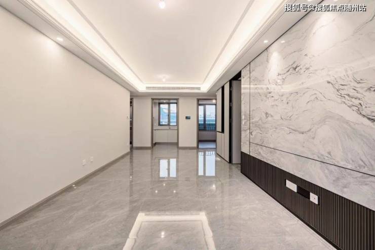 2、客厅双面背景墙:现在很多项目,连电视机背景墙都不做的情况下,翠栖府出人意料地做到“双背景墙”——电视机背景墙+沙发背景墙,开创“双背景墙”时代,其中电视机背景墙是大片岩板上墙,而沙发背景墙则是硬包的形式。提的一说的还有,主卧的背景墙,翠栖府这次也是“交付标准”。