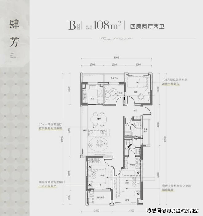 建面约108㎡、120m²的四房边套设计,不仅面积宽敞,南向双卧室+客厅大飘窗的设计也提升了居住舒适度。棠悦芳华轩建面约139㎡生活美学馆