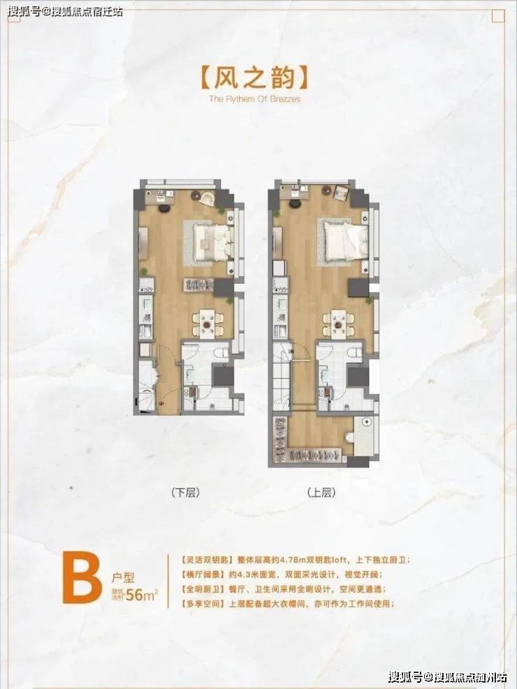 - **B户型(56㎡)**:横厅双面采光,全明厨卫设计,宜居性强。