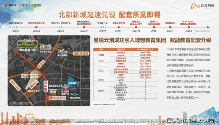 25年1月2日,余杭区教育局、杭州市理想教育集团、星缦云渚项目公司三方正式签约合作办学。由理想教育集团全面管理地铁越秀·星缦云渚配套小学,实施名校集团化办学。理想教育集团总校长俞国娣女士全面管理,力争将该校打造成为区域标杆学校,助力余杭区公办教育优质均衡发展。