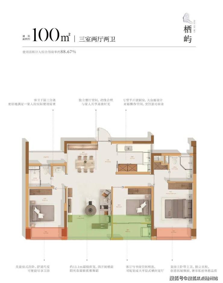 建面约89-104m²的三房、建面约115-132m²的四房,最高实际得房率达到100%,是目前杭州得房率最高的新盘之一!