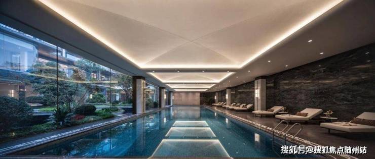 小区内除了滨江标志性的蓝宝石戏水池外,还有与下沉式庭院景观相连的室内恒温泳池。私宴厅打造了270度的落地玻璃,直面庭院,身处其中如同被全画幅景观大屏所包围。
