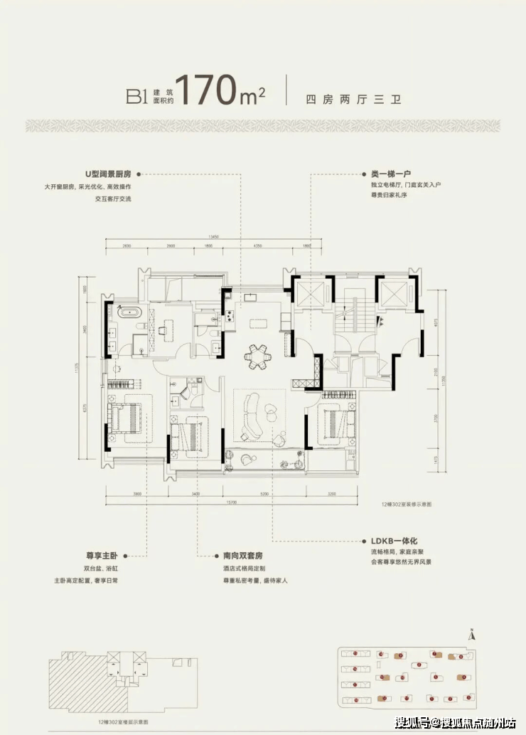 建面约170方B1户型,四房两厅三卫