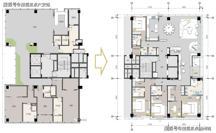 中南在三个项目实现了三连跳,每个项目不断迭代升级,一期潮上中南银座是写字楼改的,核心筒并不好,有个狭长通道,完全浪费了,350m²只有3房功能性也不满足。因此二期江澜云境阁就做了5房4套房。