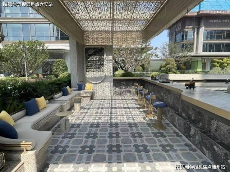 架空层空间也很丰富。7号楼架空层不仅有艺术走廊,还有独立书吧、休闲区等,往外看去就是绿植和蓝色景观水池。