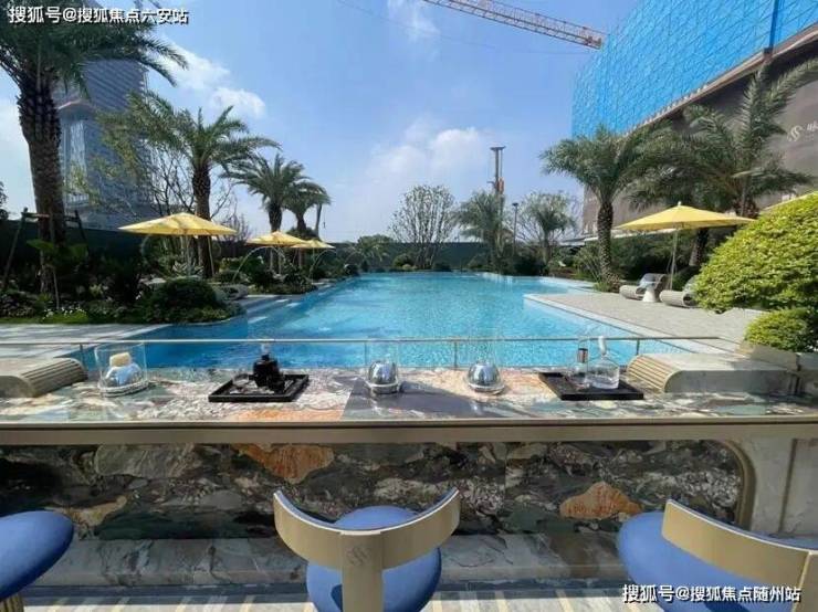 园区内做了观景亭、室外景观水池,水池外围设置了休闲躺椅、吧台,有度假酒店的氛围。