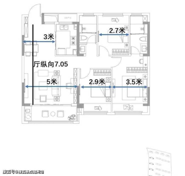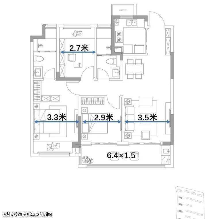 经典的小三房,胜在两卫设计,功能性很齐全,但面积注定了空间尺寸,餐厅会蛮拥挤的
