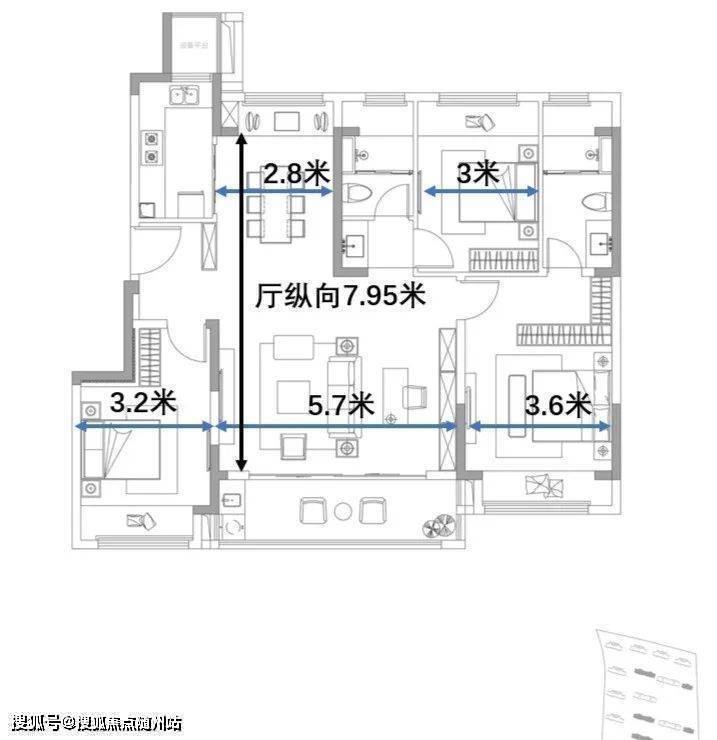 餐厅不拥挤,主卧的进深、衣帽间的空间也很充足,尤其是最容易被牺牲的厨房,也能做到2.5米开间,很厉害!