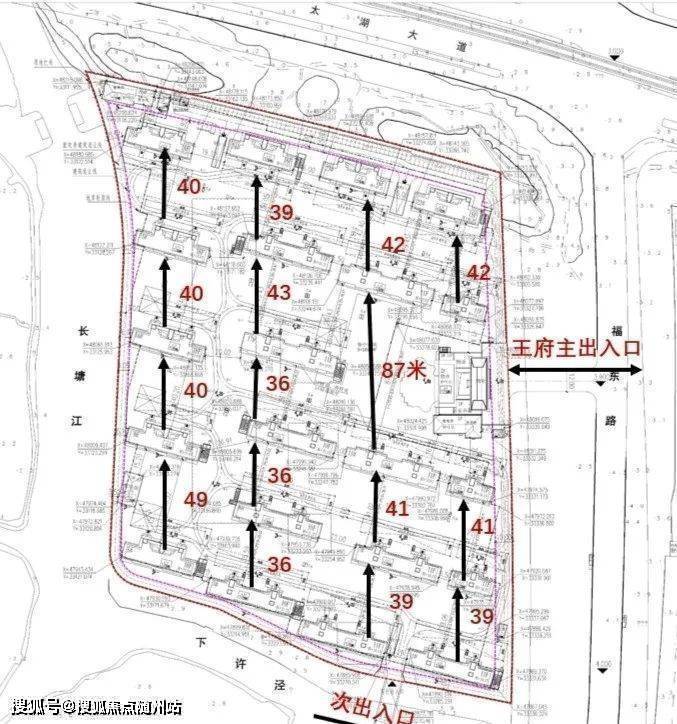 (总平面图,图中为楼幢间距)