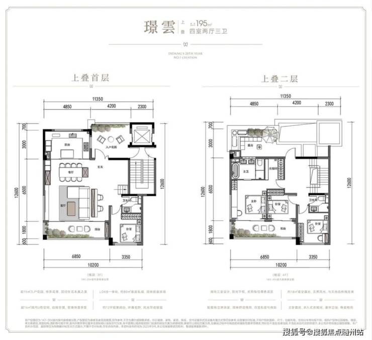 195㎡上叠:LDKB一体化约80㎡家庭厅,容纳全家互动;约14㎡U型厨房动线流畅;上叠二层南向三室+约18㎡星空露台,主卧套房配独立衣帽间,尊崇感拉满。