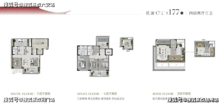 上叠C3户型“花源”建面约177㎡,正如名字一般,四季如花盛绽:一层南向约5.6米大阳台,北向超6米大进深露台;二层南向约5.6米大阳台,北向约3.65米大进深露台;顶层奢配近100平米超大露台,三重露台格局,赋予空间不同层次感的景观奢享体验,大手笔珍贵难觅。