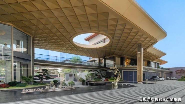 整体的抬高,让约70米宽的鎏金天幕大门头高度达到了约9米,显得格外气势非凡。天桥连接了会客厅、架空层和内部园林。