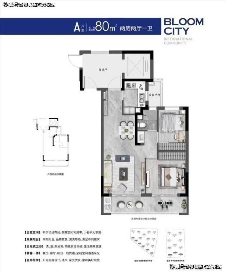 约80㎡活力两房:紧凑两房设计,主卧套房+独立衣帽间,U型厨房连接生活阳台,满足小家庭一步到位需求。