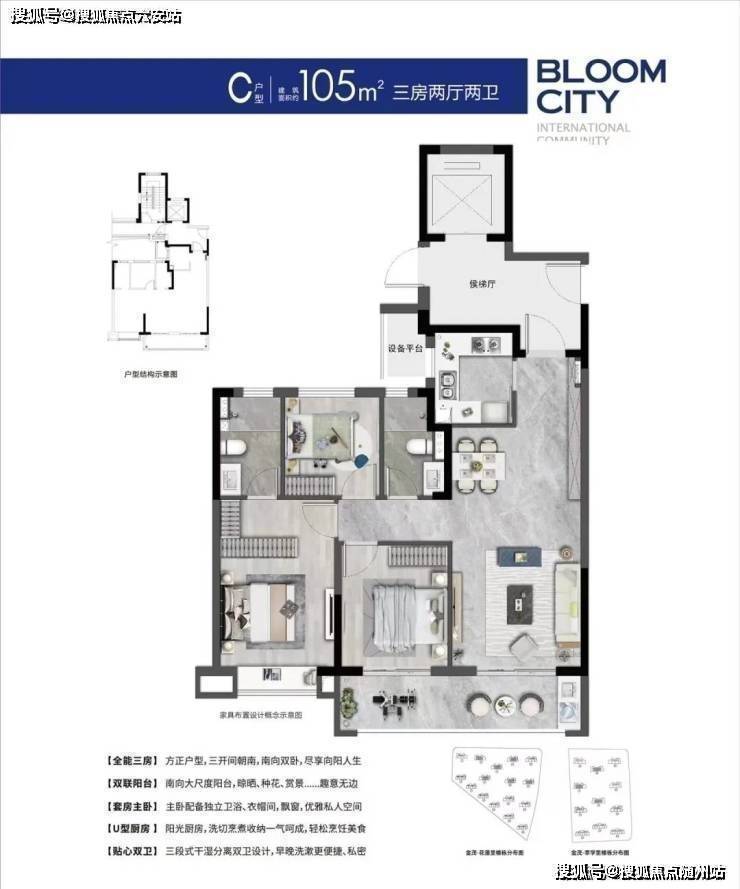约110㎡三房两卫:南北通透,双阳台布局,主卧270°观景飘窗,次卧飘窗延伸空间感,适合三代同堂或改善家庭。
