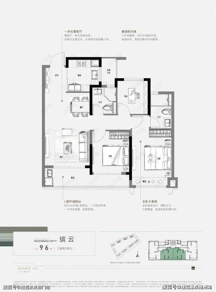 像建面约96㎡户型,整体三开间朝南设计,约9.8m奢阔尺度,户型方正大气,明亮通透,动静分区,再加上约6.6米开阔L型阳台,轻松实现一半洗衣晾晒、一般诗意生活的美妙画境。