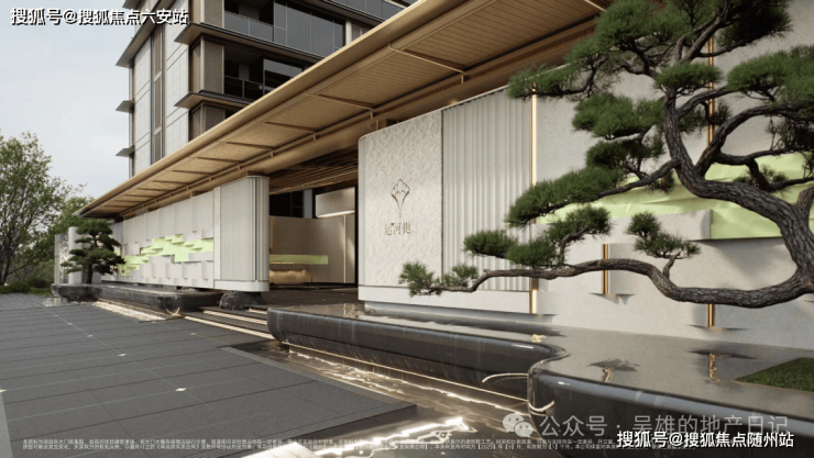 运河樾的园林感,几乎从门头就开始了:贯穿的水系、奢石景墙之上的玉石飘带,都像是把运河的水给引了过来,再配上金色的坡屋顶,很有江南院落的雅贵气质。
