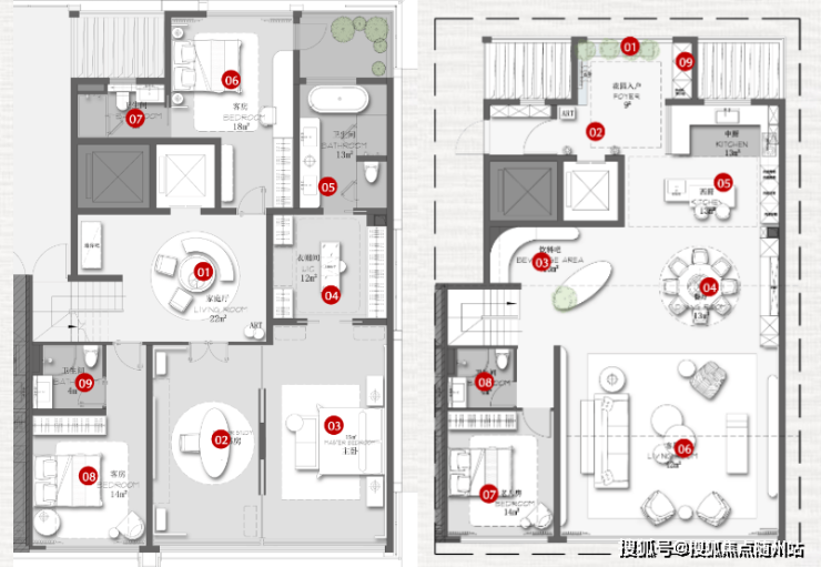 共6幢叠墅,包含上叠、中叠、下叠三类户型。户型设计包含私家庭院、电梯、地下室及露台等附赠空间,较高的空间附赠比例为业主提供个性化改造可能,通过引入自然采光与景观元素,增强室内外空间的关联性。