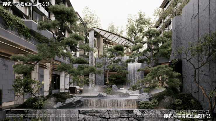 流瀑从金舟缓缓而下,流入了负一层的下沉式庭院,庭院里种满了又高又大的松树,四周一圈都是大块大块的老石皮,有野趣,也做出了贵重感。