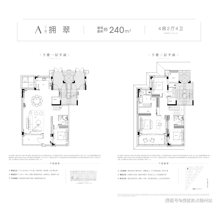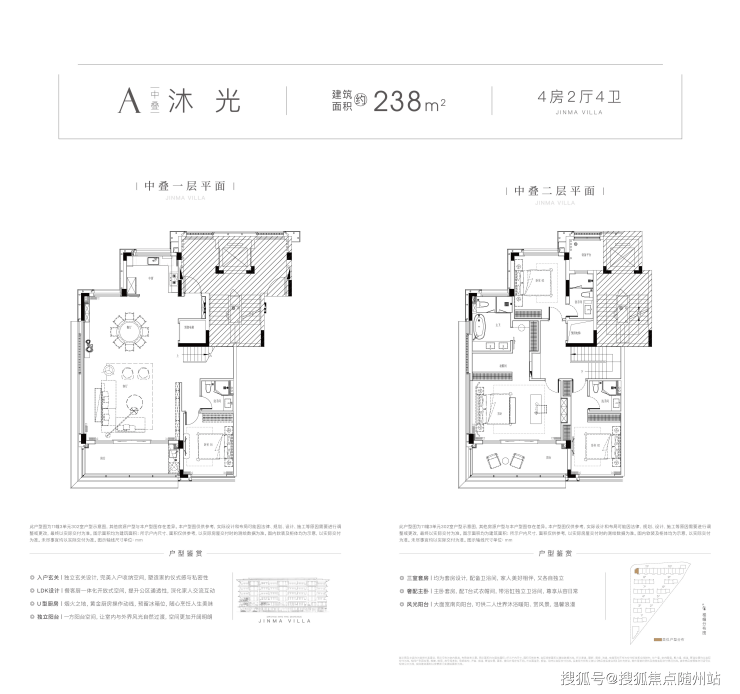 叠墅(238-270㎡):下叠6.8米挑高庭院,上叠59㎡星空露台,全套房设计+200%采光率,南向三开间布局。