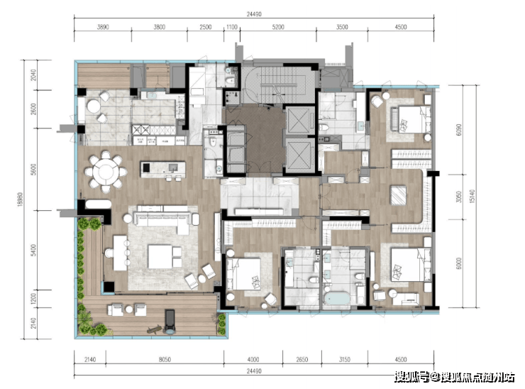 例如建面约260㎡户型,入户是居中的大面积玄关,像 “气场中转站”,归家仪式感和收纳实用性一把抓。约6.6 米大宽厅搭配南北双阳台,北阳台扛起“后勤烟火气”,南阳台直接框住“景观大片”。