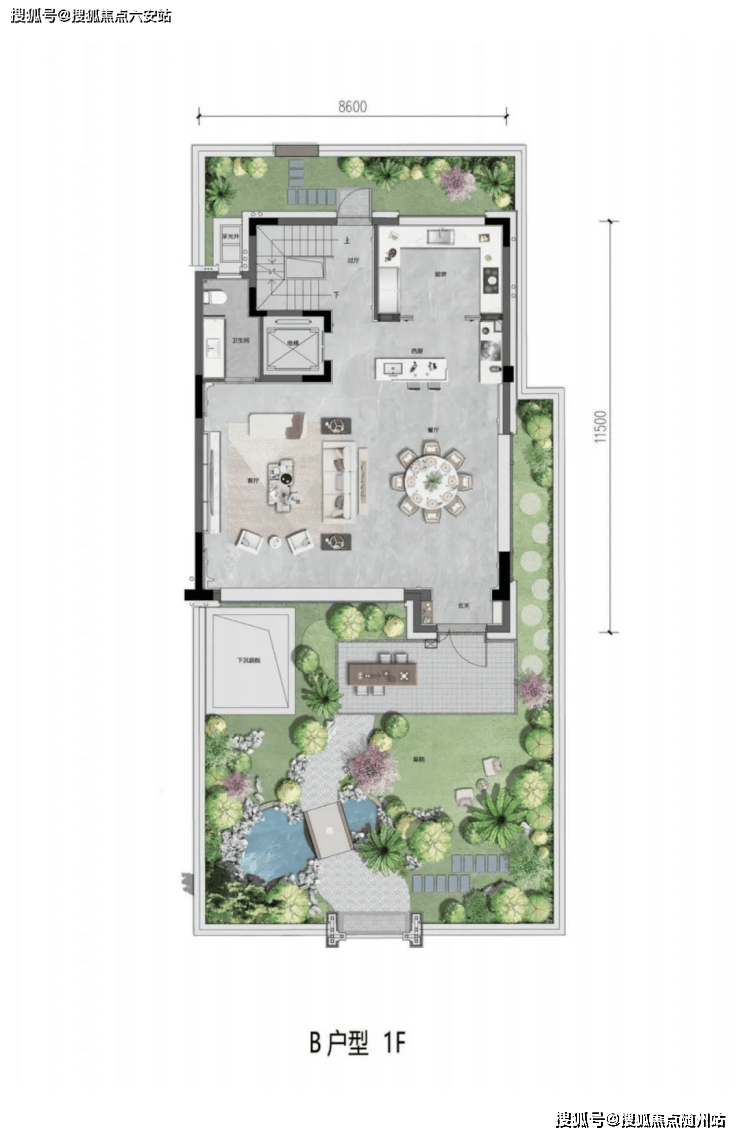 约5.8米轩朗地下空间,自然采光通风,飞瀑之下,盛放百般意趣。