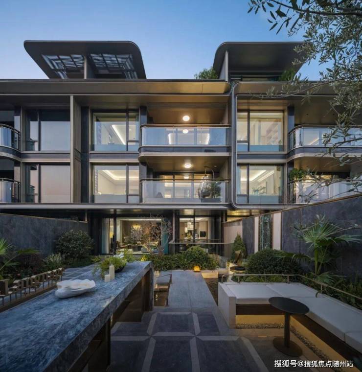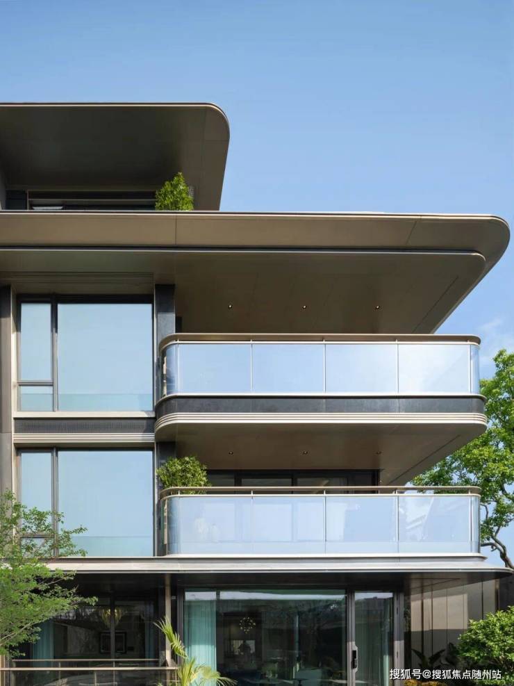 当你走近项目,一定会被那流线型的建筑立面所吸引。香槟金铝板的温润光泽、深灰铝板的沉稳质感,与圆弧玻璃的流动线条相互映衬,既保留了排屋的私密性与归属感,又赋予了建筑超越传统低密产品的现代感与艺术感。