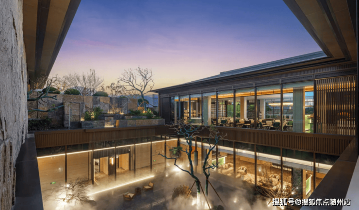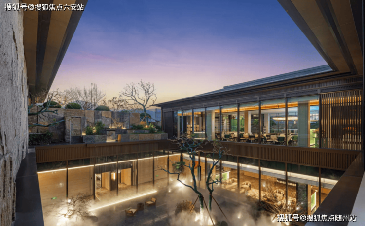 穿过景墙是下沉水院,连着售楼大厅和松林剧场,一边是水瀑潺潺,流淌成一幅古雅的宋韵山水画卷,一边是肆意舒展的罗汉松、老红梅、羽毛枫,铺展出悠远的东方意境。