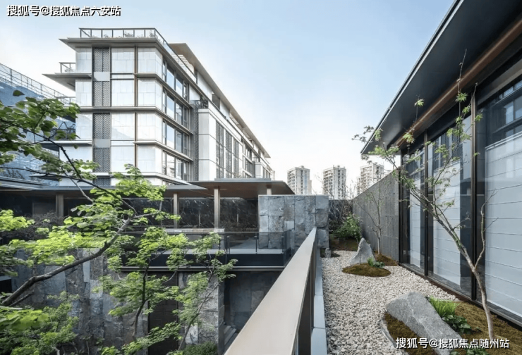 会所入口还采用了和观雲钱塘同款的柏坡黄石材打造迎宾景观,与罗汉松互相映衬。进入示范区后,古朴雅致的下沉式庭院便豁然眼前。昂贵的黑松和羽毛枫分立两侧,四角是设计师精挑细选的乌桕树,中间叠水曲折辗转,宛若自然秘境。