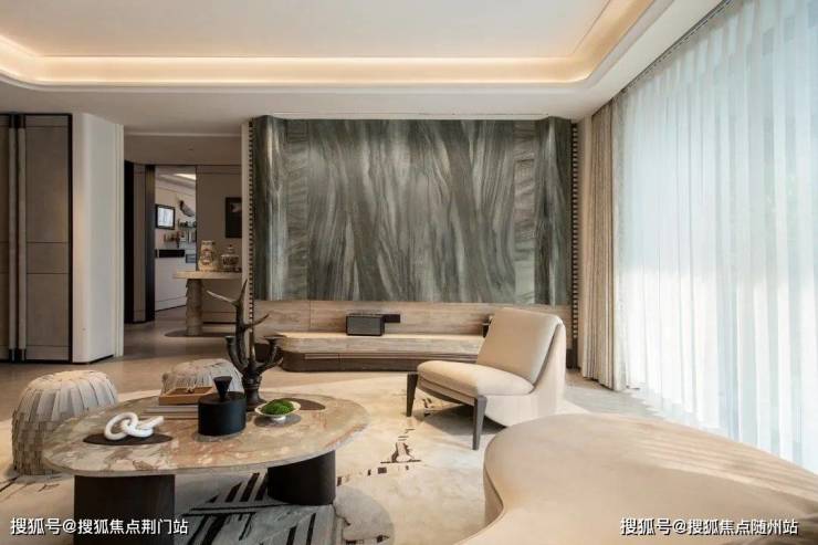 最大建面约260㎡户型则通过超白洞石、艺术漆、木饰面、木纹岩板和皮革包边等,经过数轮景观打样,最终呈现出漆砚的温润质感。