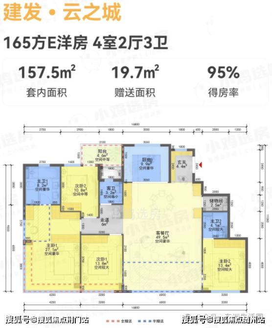 108方样板房:真南北通透、3+1设计(区别市面2+1户型),北侧无消防连廊;入户标配储藏间;四叶草户型布局,各功能空间划分细致,家庭成员生活互不干扰。
