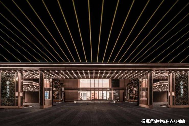 墨绿色的奢石景墙沿着两边对称排开,嵌上了粗细有致的金属线条做分割,底部是人字形纹路的铝板做拼接,到了夜晚,还能看到头顶的「满目星光」。