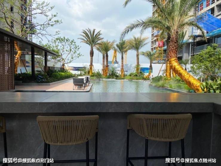 置身景观廊架之下,纵眼望去,东南亚棕榈科植物阵列其间, 约 183.5㎡ 亲子戏水池、酒店感礼仪水景相映成趣,绿荫草木、天光云影倒映于缓缓流动的水面上,宛若一幅立体的江山画卷,流动生活的无尽遐思。