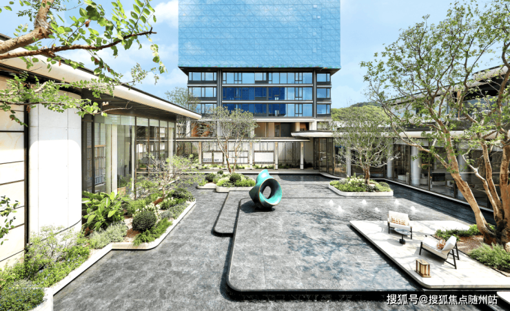 由蓝颂景观打造的“两轴一街九境N组团”园林体系,以钱塘江水景为灵感,通过立体绿化、小瀑布与休憩平台营造现代自然氛围。