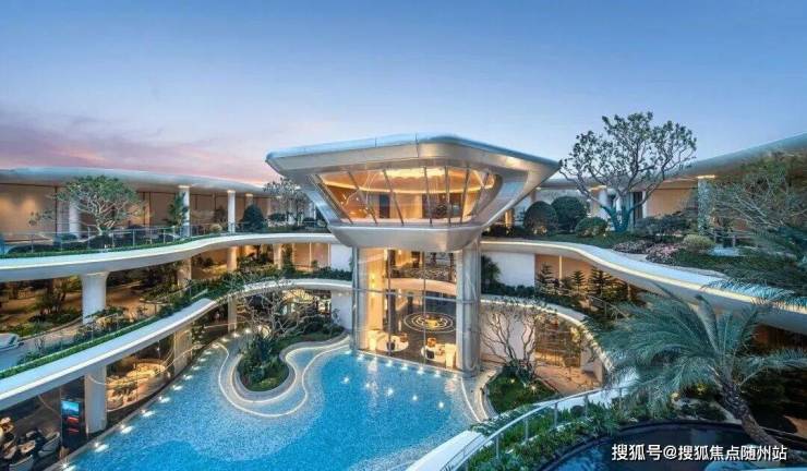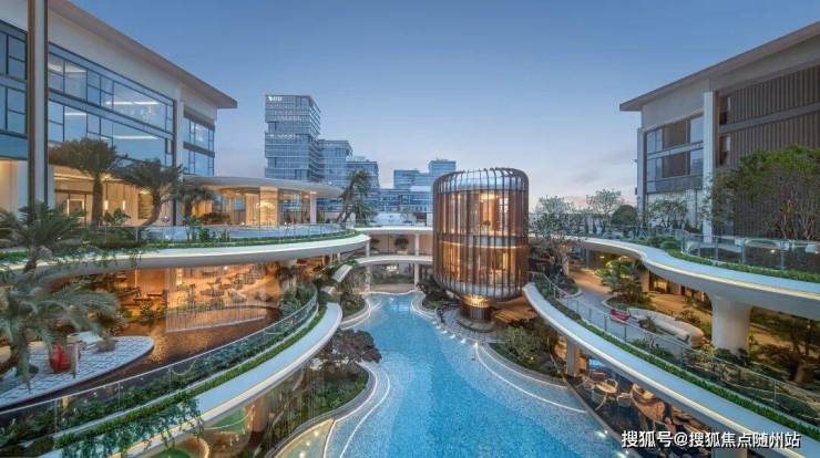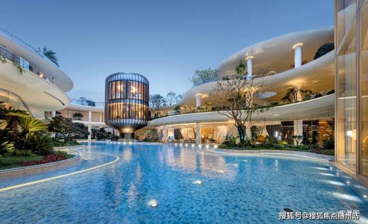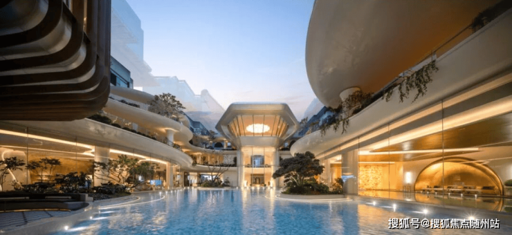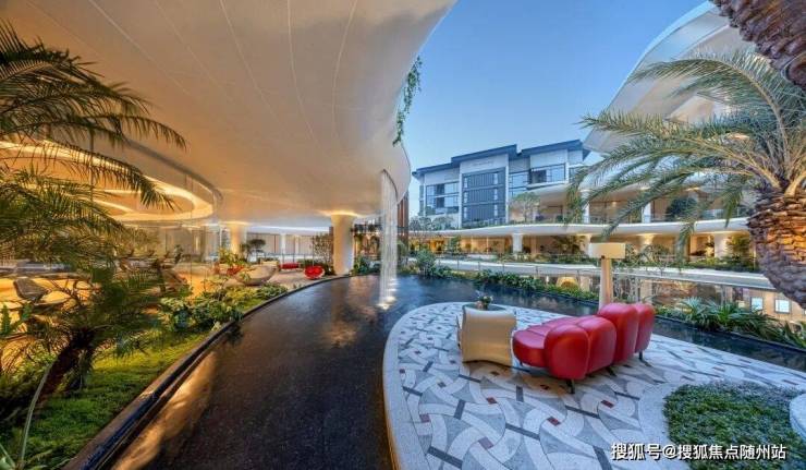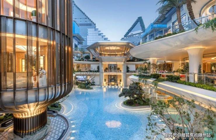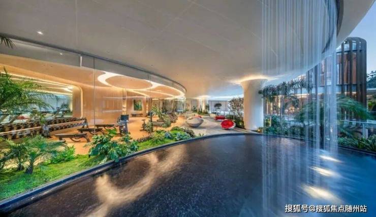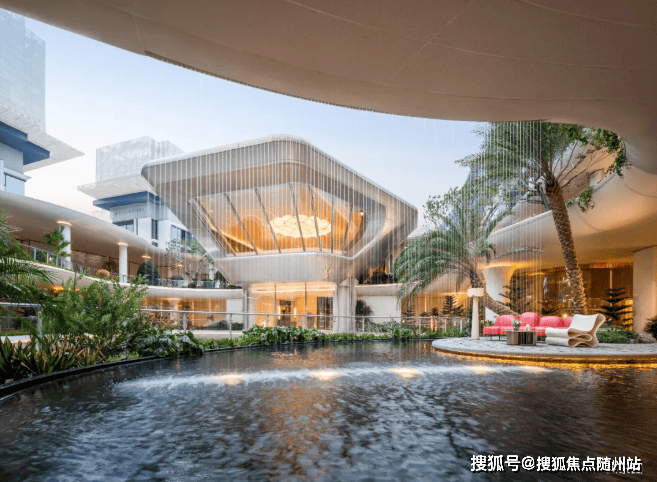 凭借约16米高差,营造穿行山水的沉浸式体验。以“两轴三庭”布局,园区中间水系面积超2500方,俯拾可见的瀑布、泳池,热带植物丛簇,犹如顶奢度假酒店。