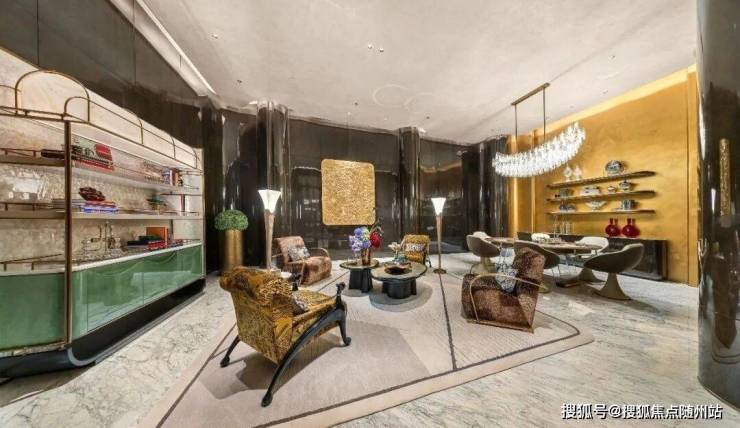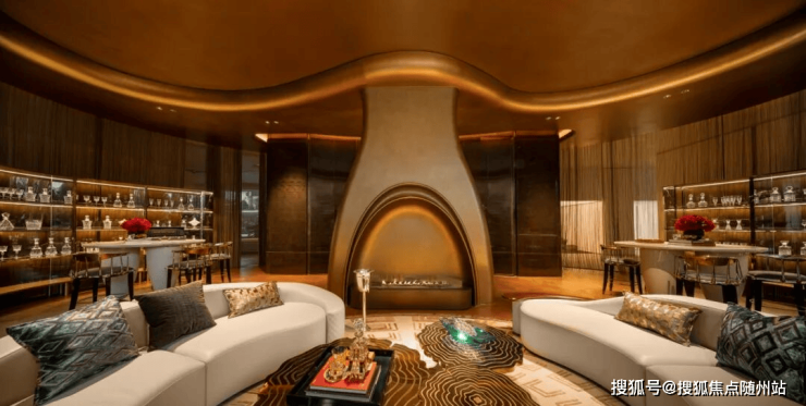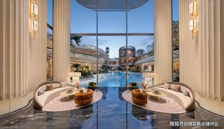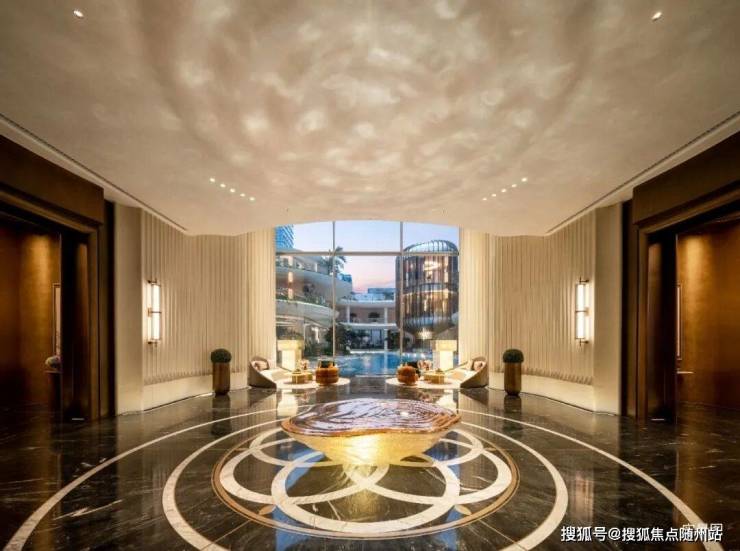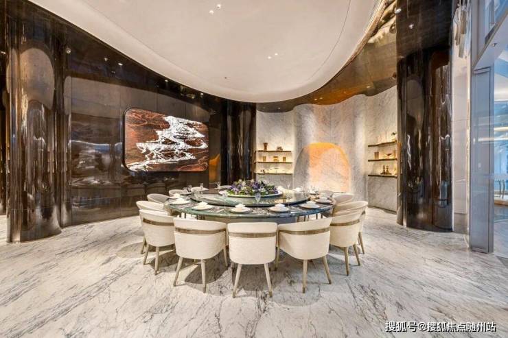 元序还花费重金做到奢石满配:中央车马厅层墙面局部采用雪花白奢石,池壁为巴西利亚黑奢石,池底铺进口黑金砂,溢水台面选用“绿野仙踪”奢石,大堂月光米黄石材,有些地面铺上了太古黑金石材,蓝水晶石材背景墙…