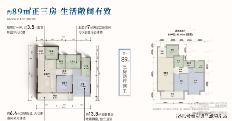 5.高得房率:89方三房户型,得房率高达90%+ ;青山湖唯一89方边套户型 户型稀缺