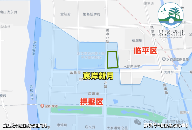 绿城·宸岸新月,也就是运河新城单元 GS1001-05地块,它位于拱墅区康桥街道龙腾街与丽水北路交叉口,步行距离在建的15号线龙腾街地铁站约650米。
