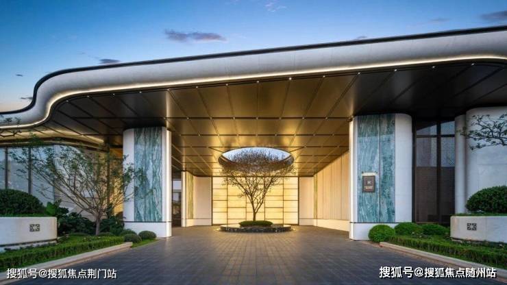 社区主入口是超宽幅门头,宽约 80m 高约 7.1m,两侧的维多利亚绿奢石以及中央的白雪公主透光石很吸睛,浅色的部分则是贝金米黄石材,圆弧的工艺处理也更显温润及价值感,中央栽植的超大紫薇树拥有约60年树龄,底部则是采用宝格丽黑奢石作为基座。