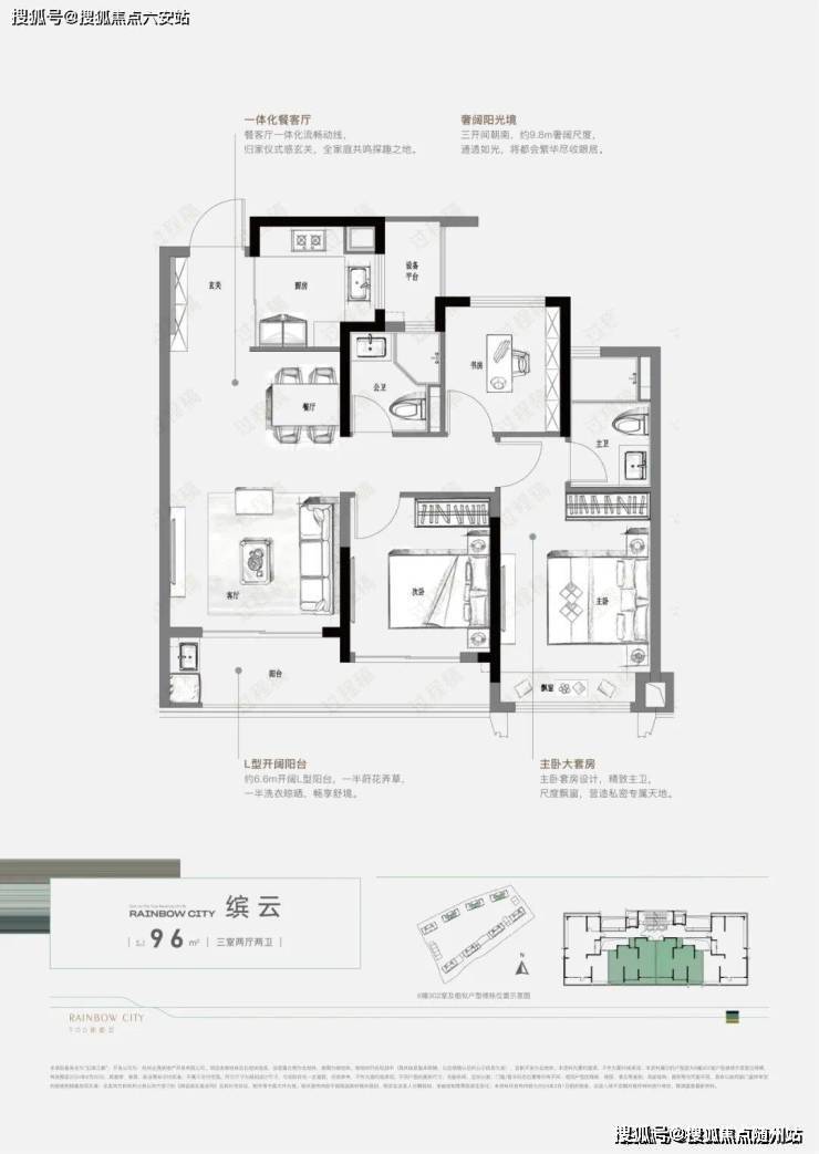 建面约96㎡的3房户型,总价维持在170万起的低门槛,对新杭州家庭价格也是难得友好的门槛,同时还把实用性做到了MAX,约9.8米的南向尺度让一体化餐客厅与两间起居室都沐浴在充沛的自然光下。