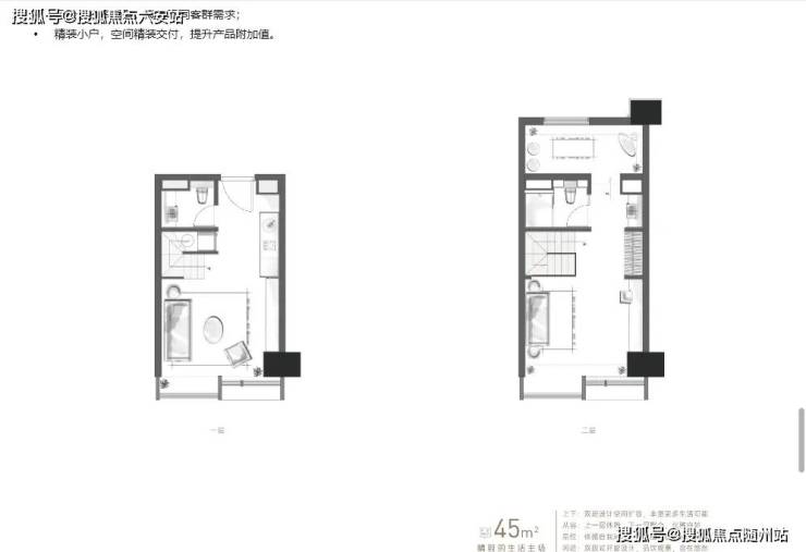 •建筑面积约45㎡户型,约4.79米层高及4.05米开间,双层设计空间,双段式开窗设计;