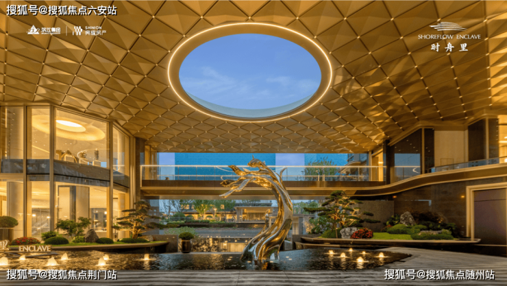 时舟里大门气势恢弘,利用地上架空车库的做法,打造了约9米高的双层高大门,鎏金天幕铺开,横向70米宽的尺度让入口的空间气场拉满。
