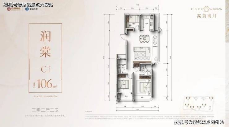 建面约106㎡边套户型拥有270°三面采光,悦享约6米大边厅配置宽屏阳台,视野开阔无遮挡。该户型设计注重功能分区明确,主卧带独立卫浴,充分保障居住隐私,体现了“小面积、高配置”的设计理念。相比板块内相近面积段中间套户型,棠前明月106边套户型采光、观景、私密性更好,舒适度媲美改善大户型。