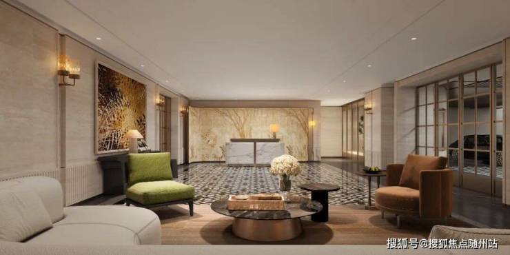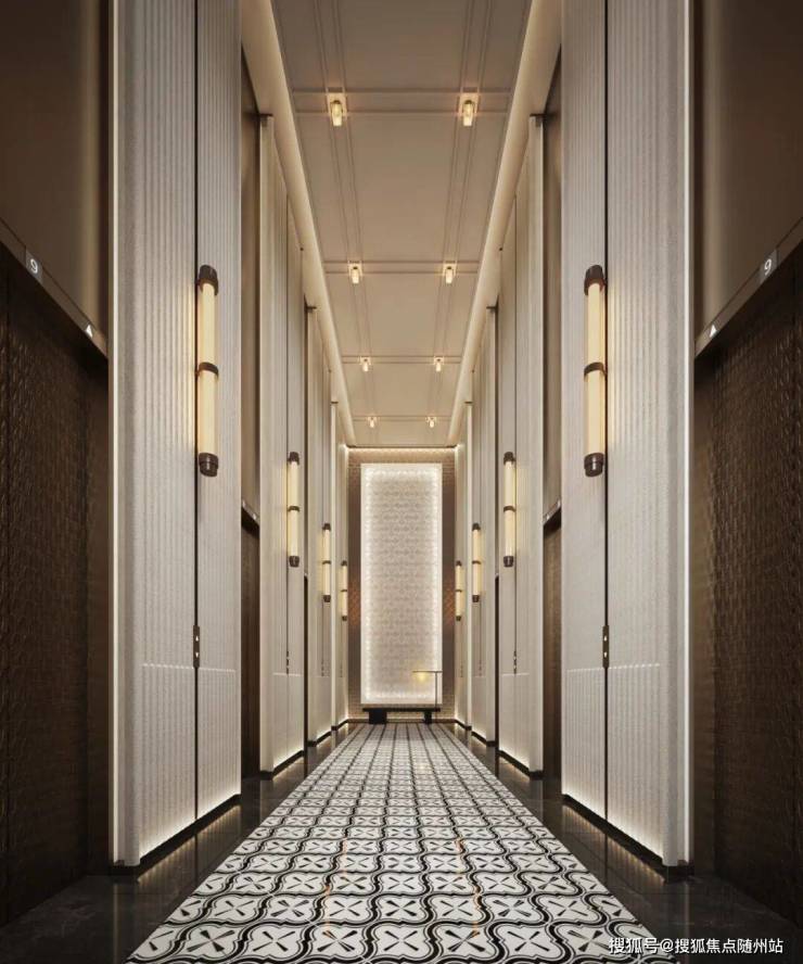而且从水刀拼花的奢石地面、原石雕琢的墙面,到“亭台楼榭”感的悬浮空间,以及和墙面纹样一致的电梯厅荷叶纹,目光所及,是一种更轻盈的奢感。