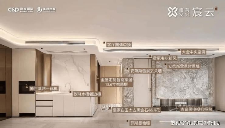 在室内精装上,宸云也采用超高的精装标准:大金中央空调、霍尼韦尔新风、博世洗碗机、博世蒸烤一体机、方太油烟机、方太燃气灶等,餐等运用大面积石材,堪称“奢石博物馆”,全屋还定制了让生活更有秩序和整洁的收纳体系,高层户户赠送储藏柜。