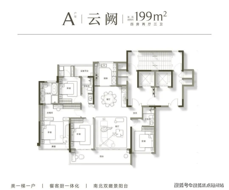 高层建面约199方,有A、B两款,四房两厅三卫双套房格局,南北通透、类独门独户、南向奢阔瞰景阳台,每一个都相当有“杀伤力”。