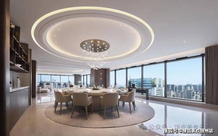 三面超白玻幕墙设计,270°环景视野,约17米巨幕面宽将四季山岚引入室内,70㎡无梁大板客厅与松涛声共鸣。- **复合功能**:首创“办公会客+宴会休憩”复合模式,东边套四房三卫双主卧,西边套四房四卫三朝南套房,空中酒廊与中西双厨满足商务与生活平衡。