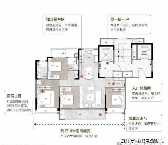 拥四大核心优势:稀缺类1T1户设计,私密入户体验;独立储藏间,收纳有序;约13.4米南向大面宽,明阔日常;LDKB设计,场景联通,多变生活。更有亮点设计——灵动X空间,定制不同家庭的改善所需;公卫干湿分离、主卧L型衣帽间呵护生活细节。
