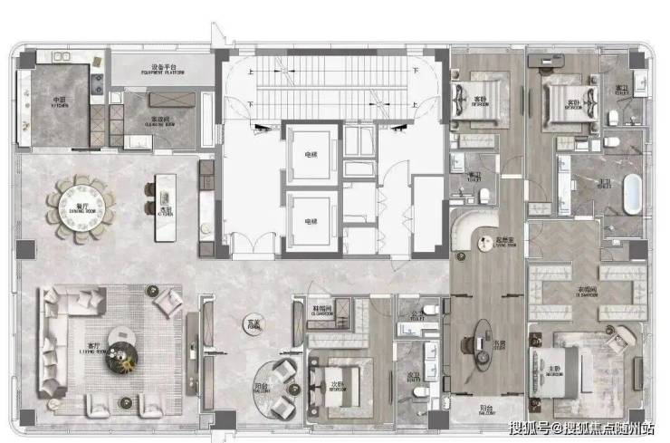 410㎡湾潮户型:WSD上海世尊团队执笔,以独一无二的“摩登东方”设计语言,抽象提取东方写意精神,与复古摩登、自由艺术平衡相融,领潮钱湾黄金时代。