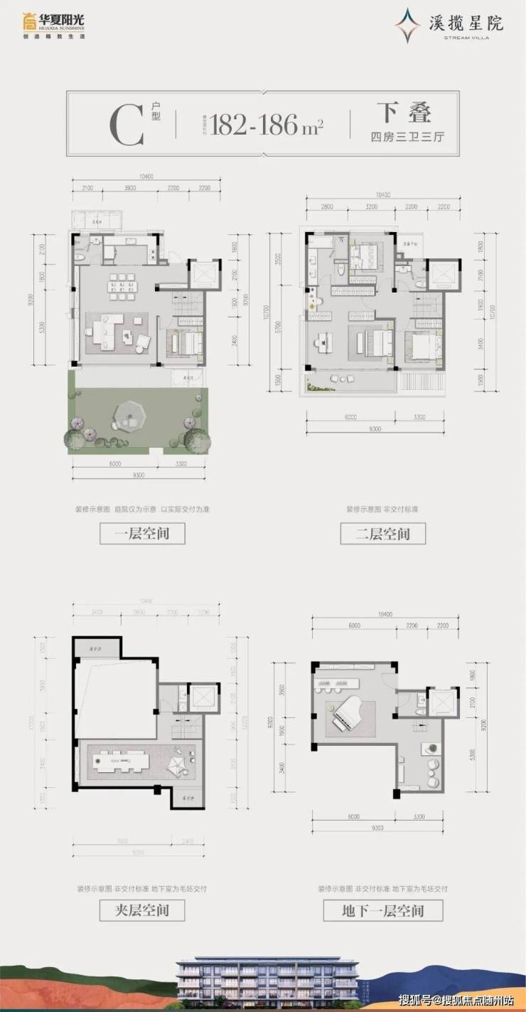 建面约182~186㎡下叠:多功能地下室/约6m瞰景阳台/豪华主卧套房/父母阳光房