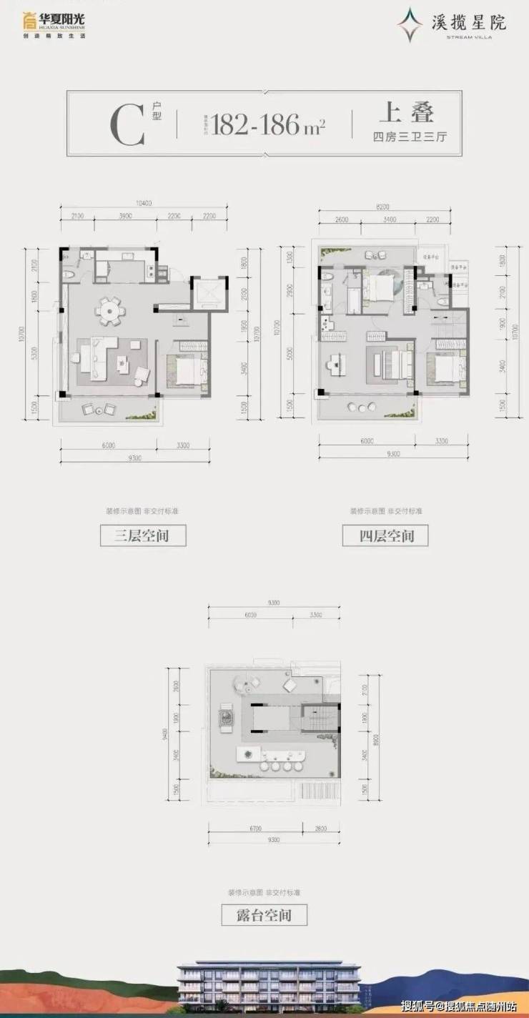 建面约182~186㎡上叠:约6m顶层观景阳台/餐客厅、书房开放设计/套房式主卧